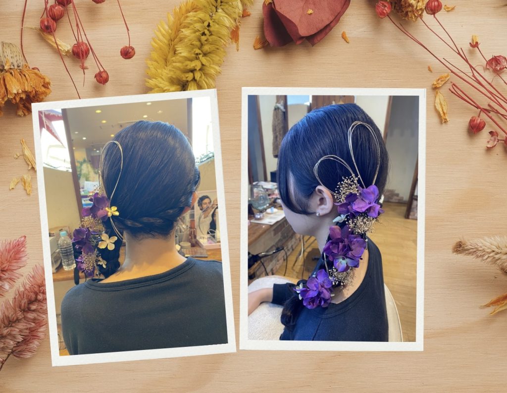 皆さんこんばんは(。・ω・。)松戸八柱美容室T.placeTieplaceの小林です! . . こんな急にってくらい急に寒くなって来ましたね〜(´・Д・) . . 今月も成人式前撮りのお客様多数でT.placeTieplaceを選んで来てくださりありがとうございます(*’▽’*) . . 横に編み下ろしでロングヘアだからこそ出来るヘアスタイルヽ(´▽`)/紫の花飾り素敵ですね(*⁰▿⁰*)華やかな気持ちになりますよね〜ヽ(*´∀`)